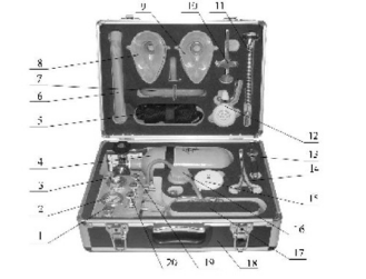 1 外氣源接口 2 壓力表 3 減壓器 4 氧氣瓶 5 頭帶 6 校驗囊、儲氣囊 7 咽喉導管